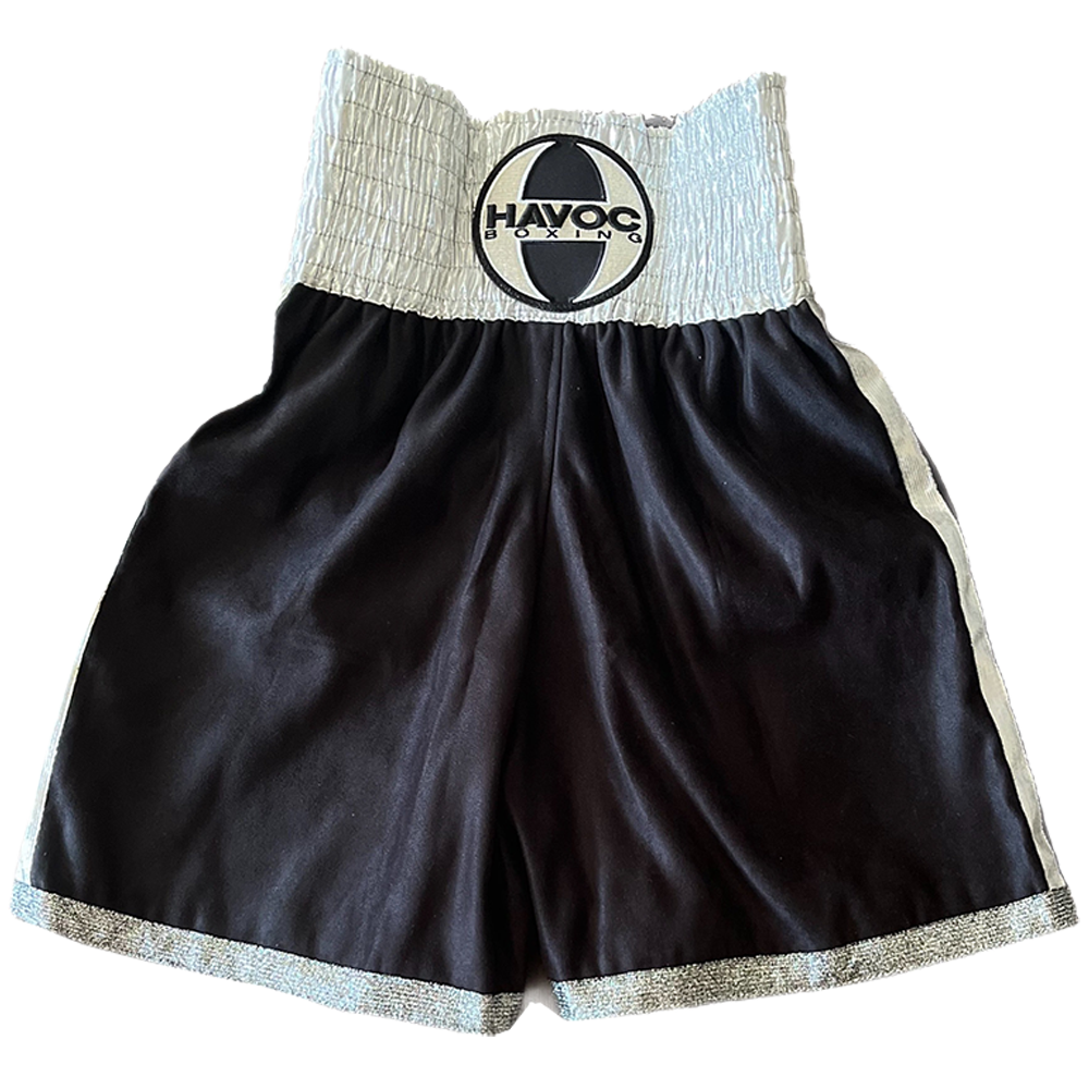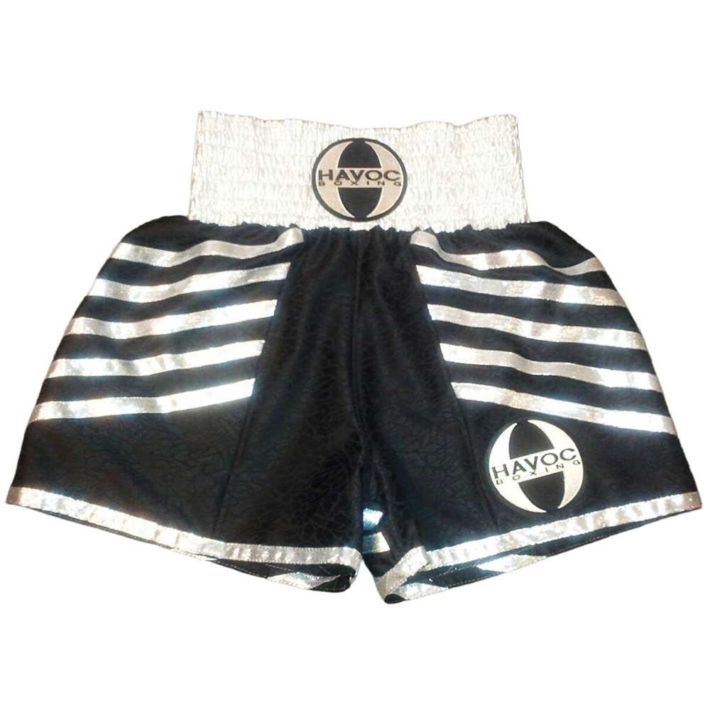 Solid Black satin with striped silver highlights with Havoc leg patch.