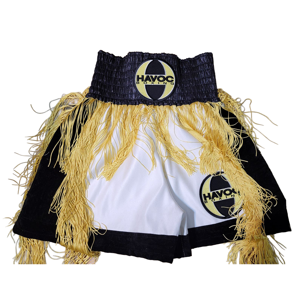 White trunks, black highlights, yellow cord tassels with Havoc leg patch.
