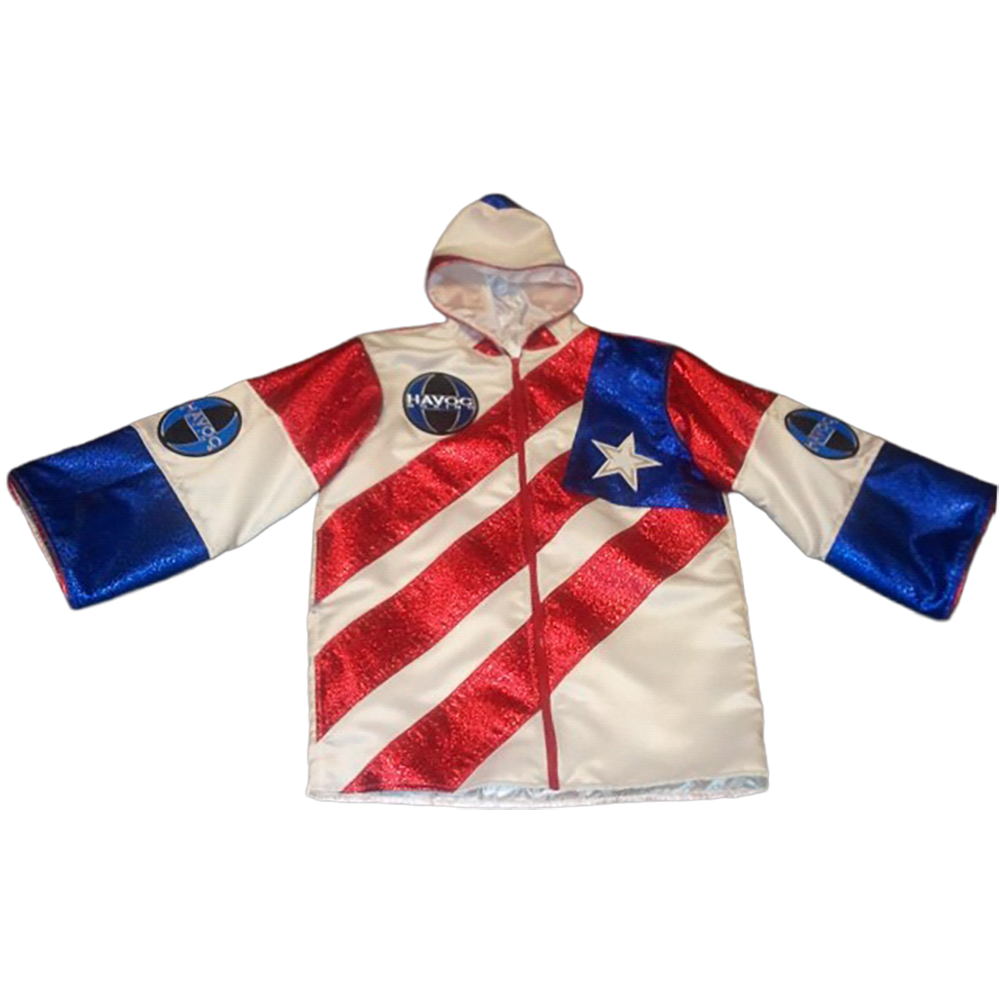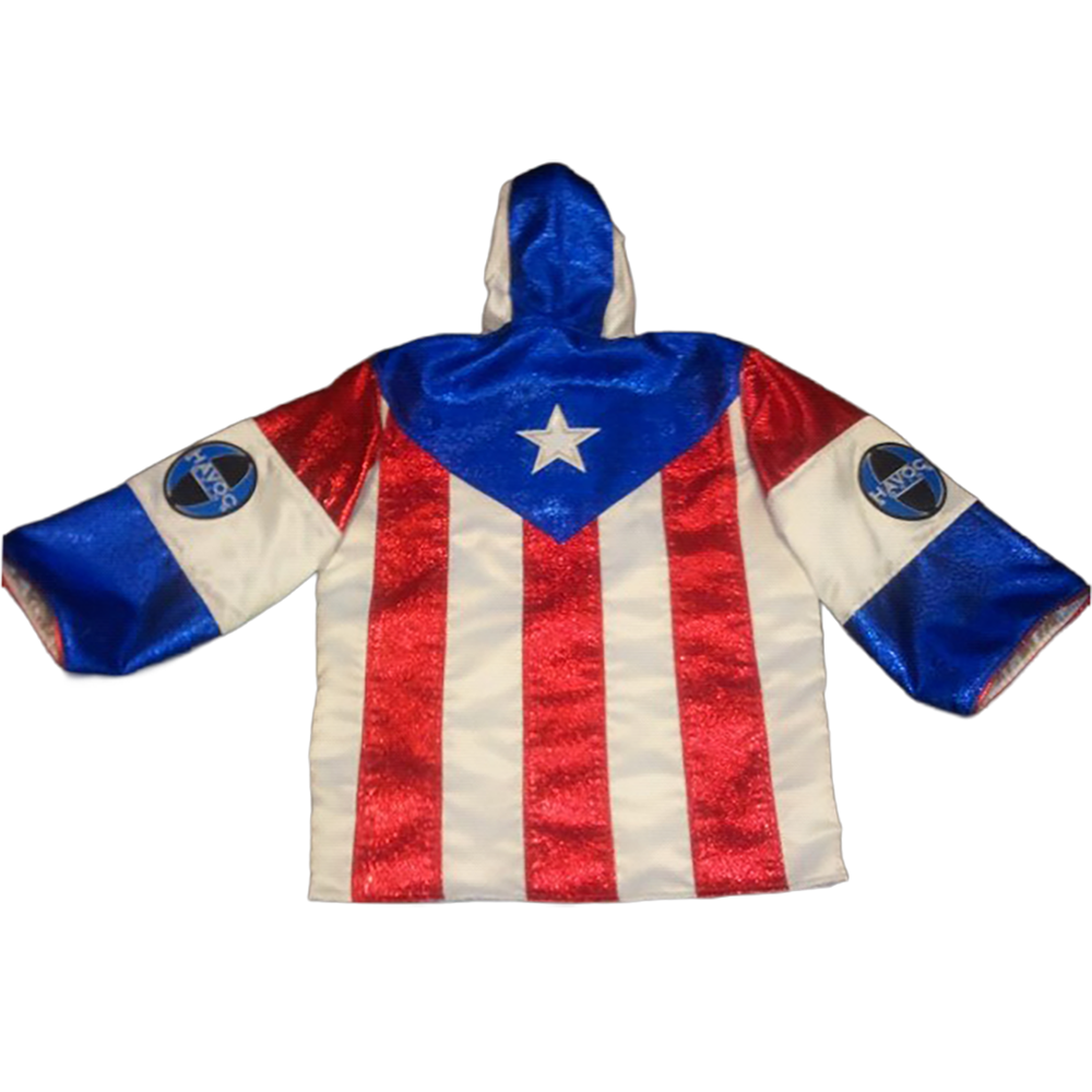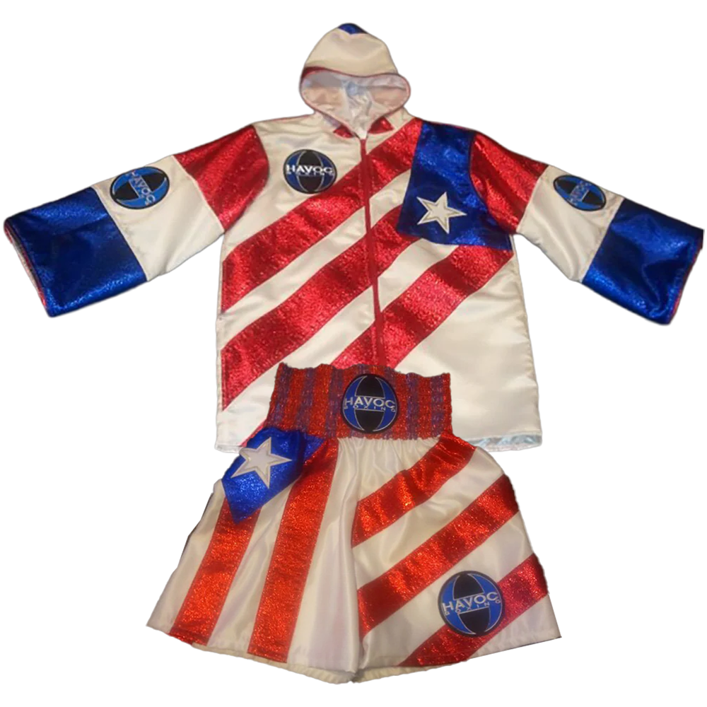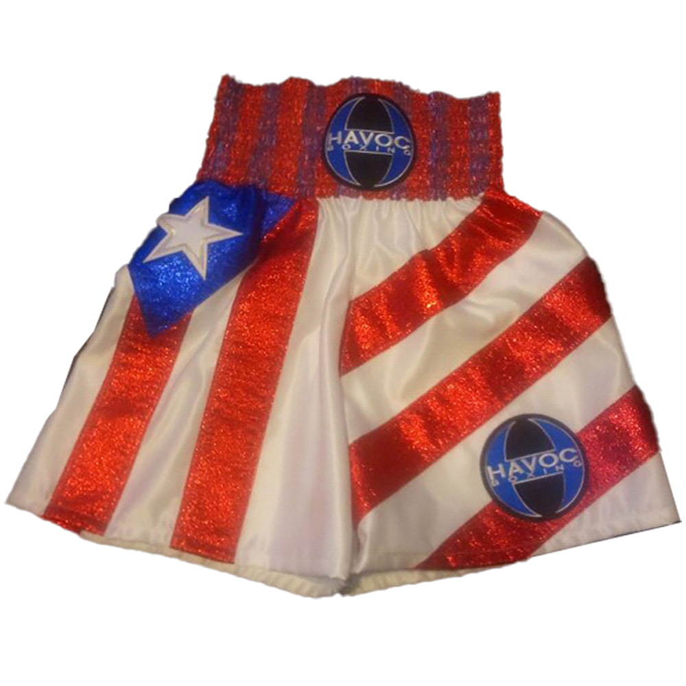 White trunks, red and blue highlights, PR flag accents with blue Havoc logo.